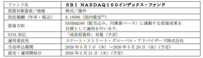 また、SBI アセットの米国株式ファンドにおける初の直接投資によるインデックス運用で、NASDAQ100 への連動を目指すインデックスファンドの中で最安※1となる信託報酬(年 0.1958%・税込)を実現。